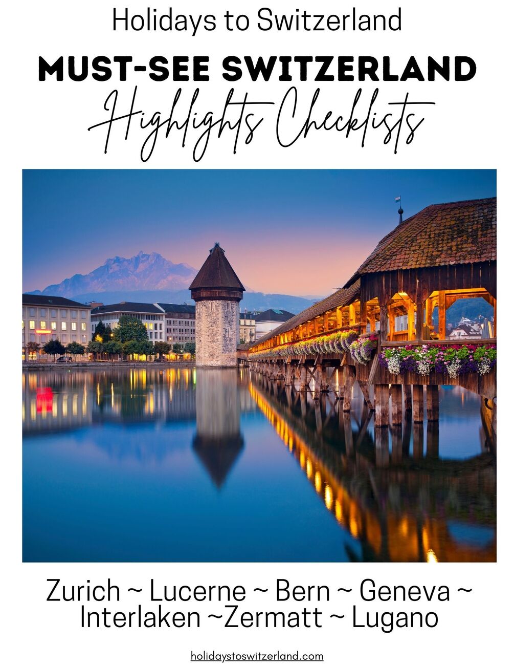 When you purchase the Must-See Switzerland Highlights Checklists you'll receive a set of 7 two-page guides for Switzerland’s most popular destinations – Zurich, Bern, Lucerne, Geneva, Interlaken, Zermatt and Lugano.